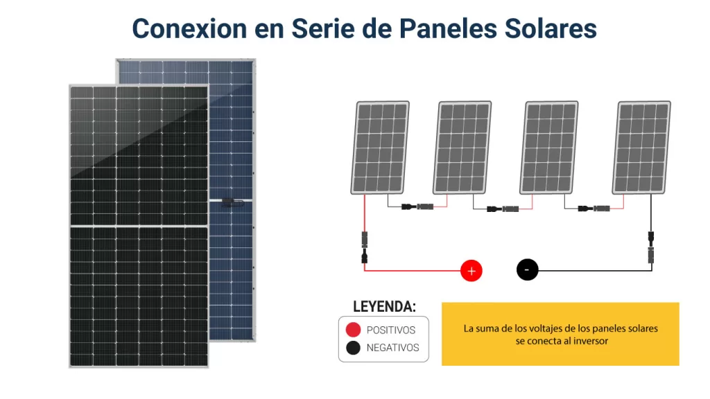 Se conectan los paneles entre sí (serie/paralelo según diseño), se lleva el cableado al inversor, se instalan protecciones (fusibles, interruptores, caja de conexiones).