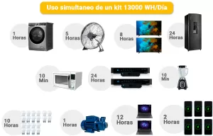 Este sistema permite generar aproximadamente 13,000 Wh (13 kWh) diarios, suficiente para alimentar electrodomésticos, iluminación LED, laptops, equipos de oficina, bombas de agua, routers y otros dispositivos de uso residencial o comercial.